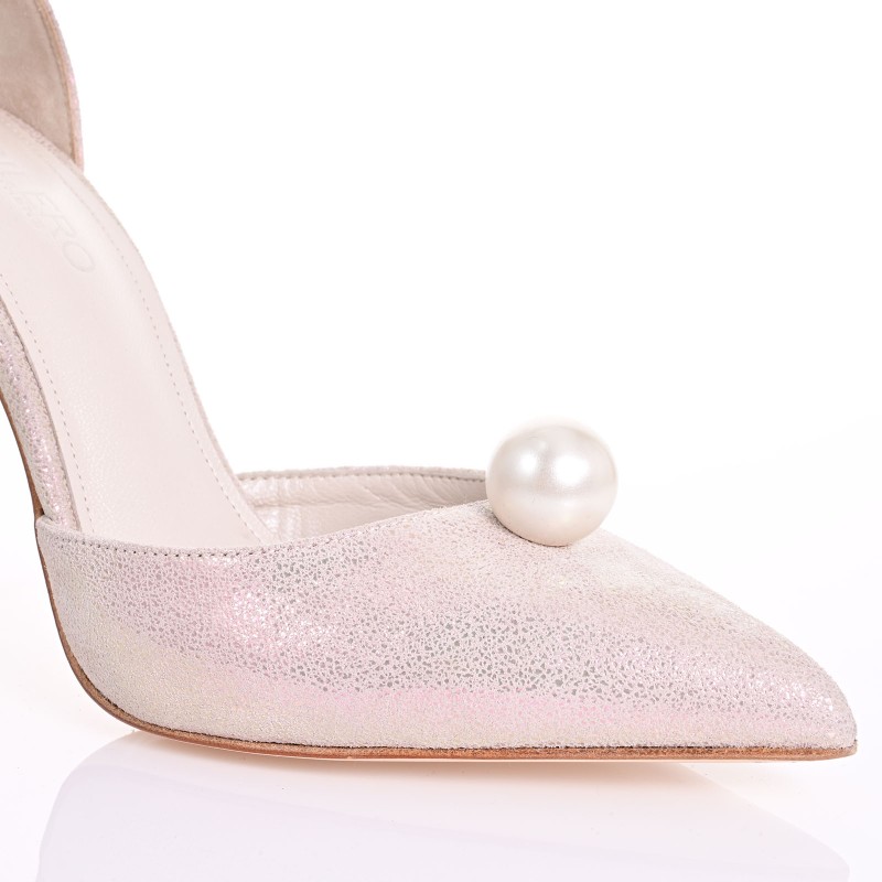 Ένα αληθινό κομψοτέχνημα που απογειώνει το bridal look! Αυτές οι χειροποίητες νυφικές γόβες, κατασκευασμένες από ασημί ιριδίζον δέρμα, αντανακλούν το φως με κάθε σας βήμα, δημιουργώντας ένα αιθέριο εφέ λάμψης. Το λεπτεπίλεπτο τακούνι των 9,5cm χαρίζει ύψος και χάρη, ενώ η διακοσμητική πέρλα στο μπροστινό μέρος αποτελεί μια πινελιά διαχρονικής πολυτέλειας. Ιδανικές για νύφες που θέλουν να εντυπωσιάσουν με κομψότητα και στυλ, συνδυάζοντας μοντέρνα αισθητική με ρομαντική φινέτσα.