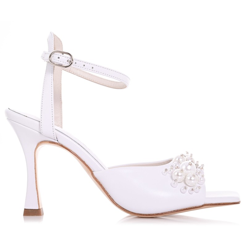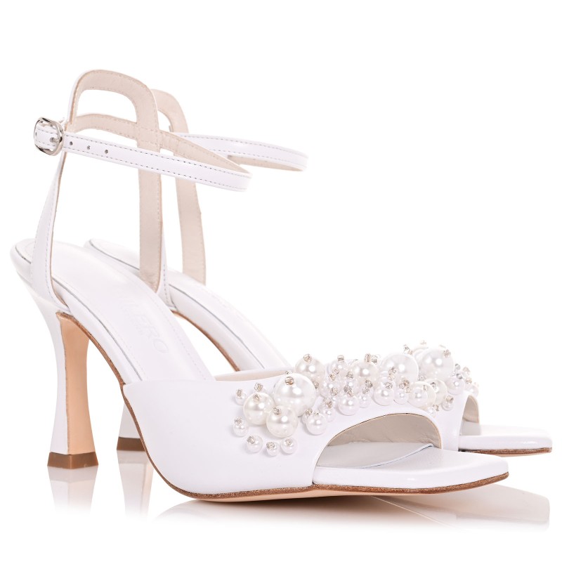 Elegance meets craftsmanship in these exquisite bridal sandals, crafted from white leather and delicately adorned with hand-sewn pearls at the front. The 8.5cm heel offers perfect posture and comfort, while the Memory Gel insole gently cushions each step. Finished with a Nubuck leather sole for stability and a smooth stride, these sandals are designed for the bride who desires timeless beauty with couture-level detail.