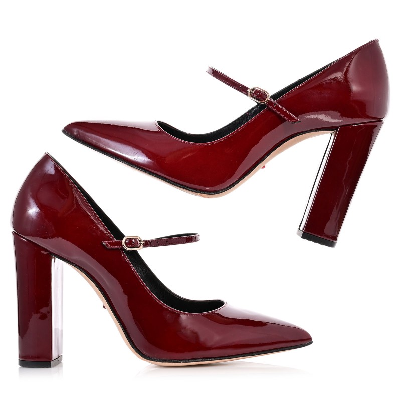 Elevate your style with the handmade BILERO women's heels in bordeaux patent leather, offering a timeless sense of luxury. The glossy finish in deep bordeaux adds sophistication, while the 9.5 cm block heel provides comfort and stability with every step, making them ideal for everyday wear or formal occasions.