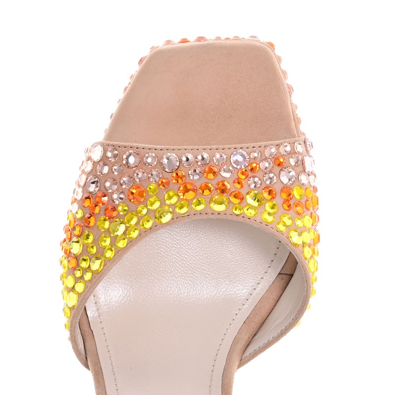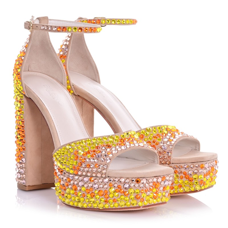 Αυτά τα χειροποίητα μπεζ πέδιλα από δέρμα καστόρι αποτελούν την απόλυτη επιλογή για κομψές και εντυπωσιακές εμφανίσεις. Με τακούνι 13cm και τετραγωνισμένη φιάπα 3cm, προσφέρουν θηλυκή γραμμή και σταθερότητα. Τα πολύχρωμα στρας μπροστά προσθέτουν μία παιχνιδιάρικη λάμψη που μαγνητίζει τα βλέμματα. Το Memory Gel κάτω από το πατάκι εξασφαλίζει άνεση σε κάθε βήμα, ενώ η Nubuck σόλα προσφέρει ασφάλεια και σιγουριά στις κινήσεις.