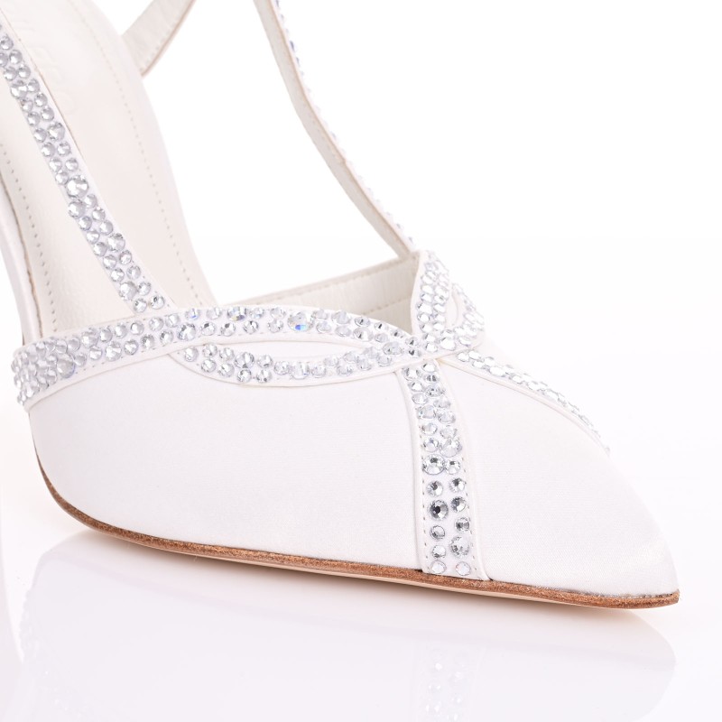 Οι Aurora είναι η απόλυτη νυφική επιλογή για τη μέρα που όλα πρέπει να είναι τέλεια. Χειροποίητες από φίνο λευκό σατέν και διακοσμημένες με λαμπερά στρας που αιχμαλωτίζουν το φως, αυτές οι γόβες προσθέτουν κομψότητα και φινέτσα σε κάθε σας βήμα. Το ψηλό τακούνι 9,5 cm προσφέρει εντυπωσιακή σιλουέτα, ενώ το Memory Gel κάτω από τον πάτο μειώνει τους κραδασμούς, εξασφαλίζοντας άνεση. Η γνήσια δερμάτινη σόλα Nubuck ολοκληρώνει την πολυτελή αίσθηση.