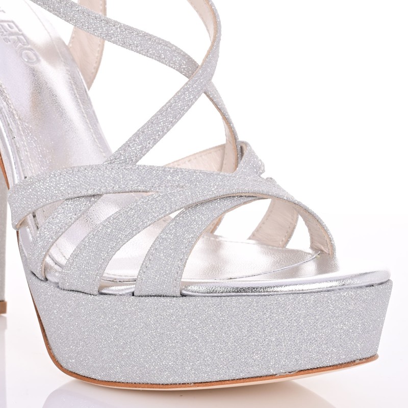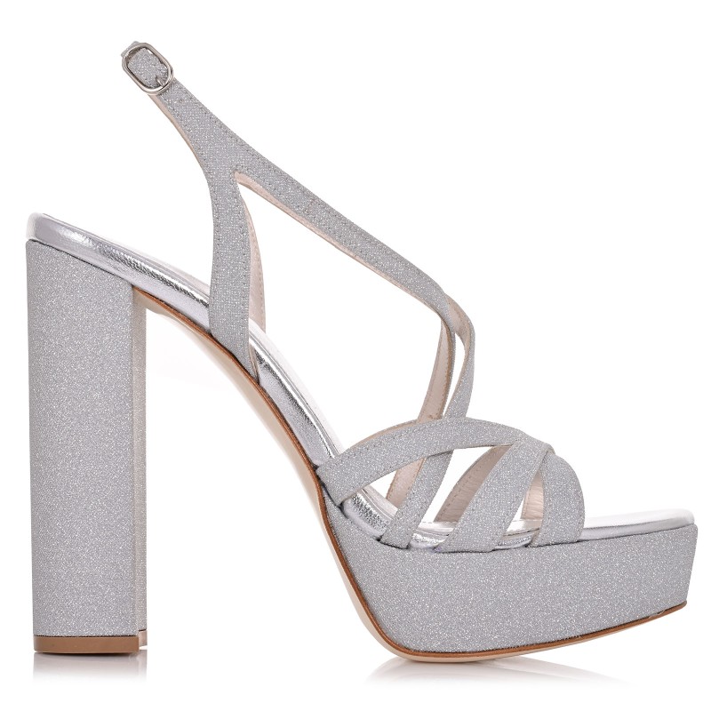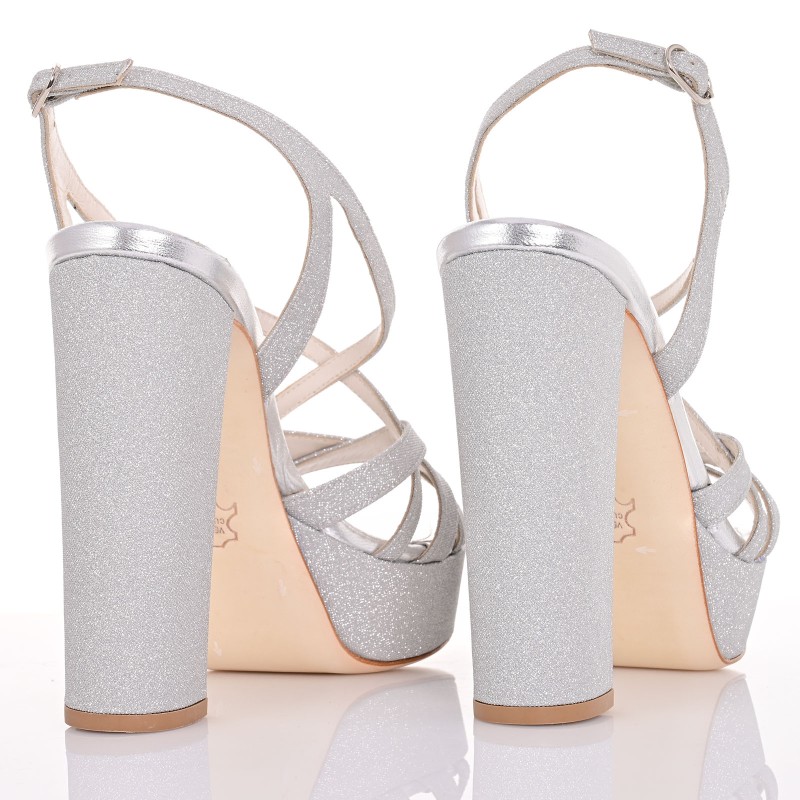 Για τη νύφη που αναζητά εκθαμβωτική λάμψη και σταθερότητα στο περπάτημα, αυτά τα χειροποίητα πέδιλα σε ασημί glitter είναι η απόλυτη πρόταση. Με χοντρό τακούνι 13cm και φιάπα 3cm, εξισορροπούν το ύψος με άνεση. Η τεχνολογία Memory Gel στον πάτο απορροφά τους κραδασμούς, ενώ η δερμάτινη σόλα Nubuck εξασφαλίζει σταθερότητα σε κάθε βήμα. Μια glamorous επιλογή που συνδυάζει λάμψη, ποιότητα και άνεση.