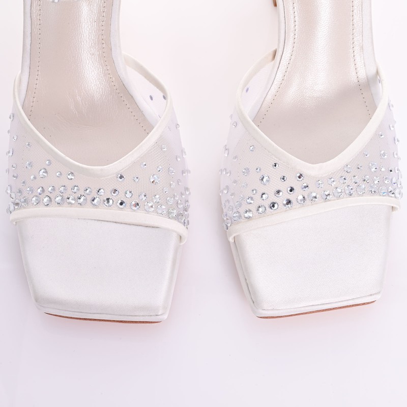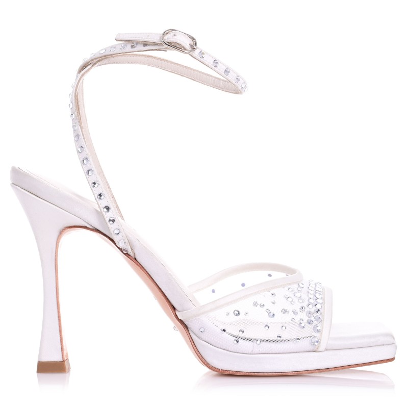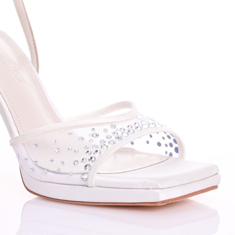 Απογειώστε τη νυφική σας εμφάνιση με αυτά τα εκθαμβωτικά χειροποίητα πέδιλα από πολυτελές λευκό σατέν. Τα λαμπερά στρας στο μπροστινό μέρος και στα πίσω λουράκια προσθέτουν έναν αέρα λάμψης και κομψότητας, ενώ το τακούνι 9,5cm με τη φιάπα 1cm εξασφαλίζει σταθερότητα και άνεση. Ο ειδικός πάτος με Memory Gel μειώνει τους κραδασμούς, προσφέροντας εξαιρετική άνεση, ενώ η δερμάτινη σόλα Nubuck χαρίζει σταθερότητα σε κάθε σας βήμα. Ιδανική επιλογή για τη μέρα που θέλετε να λάμπετε!
